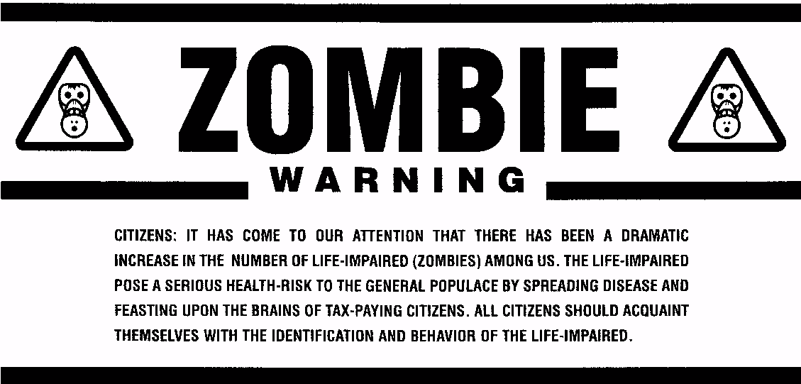 | CITIZENS: IT HAS COME TO OUR ATTENTION THAT THERE HAS BEEN A DRAMATIC INCREASE IN THE NUMBER OF LIVE-IMPAIRED (ZOMBIES) AMONG US. THE LIFE-IMPAIRED POSE A SERIOUS HEALTH-RISK TO THE GENERAL POPULACE BY SPREADING DISEASEAND FEASTING UPON THE BRAINS OF TAX-PAYING CITIZENS. ALL CITIZENS SHOULD ACQUAINT THEMSELVES WITH THE IDENTIFICATION AND BEHAVIOR OF THE LIFE-IMPAIRED. |